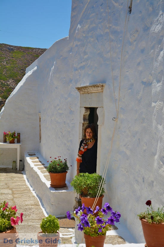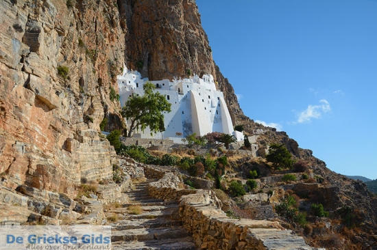 Ik verblijf in de bad-havenplaats Katapola. Het is vroeg in de ochtend en mijn eerste bestemming is vandaag het klooster Chozoviotissa in het oosten van het eiland. Het is een indrukwekkend klooster met een rijke historie, het ligt tegen de kliffen van steile rotsen uitkijkend naar de zee. Ik parkeer de auto op een open ruimte en loop de meer dan 300 trappen omhoog. Hoe meer ik het klooster nader, des te indrukwekkender het klooster wordt. Het klooster bestaat uit 8 etages en is maximaal 5 meter breed. Via een klein deurtje, waar ik moet bukken loop ik het klooster in. De ruimte is zeer smal. Vanaf daar loop ik een smalle trap naar boven en kom in een andere ruimte uit. Ik hoor een stem roepen, “kom maar naar boven”.