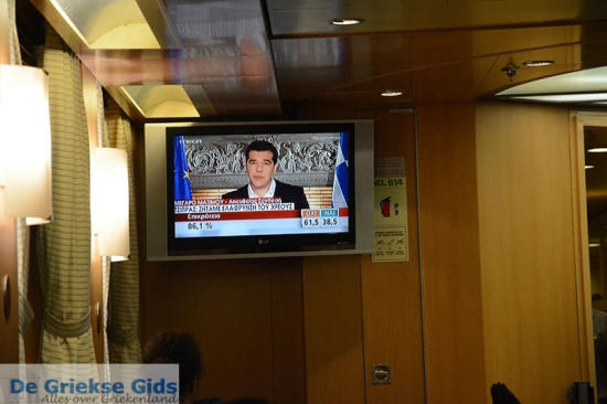 Even later stap ik op de boot en om 19.00 uur verlaat de boot Amorgos. Op de TV-schermen van de boot zijn allerlei programma’s bezig over het referendum. Even later verschijnen de eerste uitslagen waaruit blijkt dat de Grieken “Neen tegen de bezuinigingen” hebben gestemd. Ik ben blij, toch mag ik me zorgen. Ik verwacht weer een Dijsselbloem te zien verschijnen om te vertellen dat de Grieken fout zijn!
