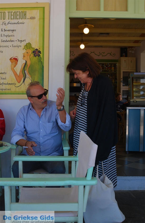 Het is inmiddels middag en ik zie een leuk restaurantje in het hart van het dorp. De ober heet Venizelos en komt uit Kreta. Geweldig! Venizelos vertelt me dat hij met zijn vrouw in de winter naar Nederland wil komen, natuurlijk geef ik hem meteen tips. Op dat moment wordt ik op de rug getikt door een mevrouw: “Hey Griekse Gids zegt ze”. Marion, zo heet ze, is Nederlands en is met een Engelsman (David) getrouwd uit Devon in zuidwest Engeland. Ze is gek op Griekenland en heeft bijna alle Griekse eilanden gezien. Ze vertelt me dat ze op Andros en Kea was en dat ze leuk gewandeld heeft. Vanaf Amorgos gaat ze nog naar Naxos een paar dagen en dan terug via Athene naar Engeland. Zij is dol op het Griekse eten, de eilanden en last but not least de vriendelijke mensen.