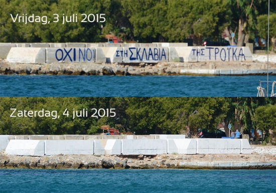 De hele dag heb ik het eiland rondgecrosst en mooie foto’s gemaakt. Toen ik ’s avonds terug in Katapola was, was de leus ‘Ochi stin sklavia tis Troika’ met andere woorden ‘Neen tegen de slavernij van Trojka’ met witte verf overgeschilderd. Ik was gisteren dus precies op tijd om het beeld te vereeuwigen.