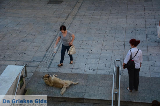 Het is erg interessant om zo vroeg in de ochtend mensen waar te nemen. Wat zouden ze denken? Waar zouden ze heengaan? Ik zie een oude man met een wandelstok een half uur lang, voor het parlement met een langzame pas, heen en weer lopen. Ik zie toeristen bij de wacht bij het parlement foto’s maken. Maar er gebeurt opeens iets wat mij ‘happy’ maakt. Een Griekse mevrouw komt aanzetten met een zak vol hondenbrokken. Op het Syntagmaplein liggen hier en daar zwerfhonden te slapen. Ze loopt bij iedere hond langs, maakt deze op een lieve manier wakker, aait ze, en geeft ze hondenbrokken. Een lekker ontbijt voor de zwerfhonden. Hoe lief kan een mens zijn?
