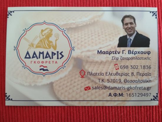 Iedereen die meer wil weten, langs wil komen of wat wil bestellen gaat naar de bakkerij in Peraia. Plateia Eleftherias 8 in Peraia met telefoonnummer 0030 698 302 18 36 of anders even kijken op www.damaris-gkofreta.gr of mailen naar sales@damaris-gkofreta.gr Maarten staat u te woord.