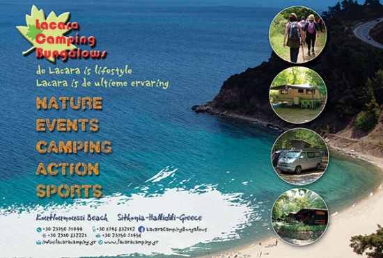 Het belangrijkste kenmerk van onze camping zijn de bomen die veel schaduw aan de kampeerders bieden. Dat, in combinatie met de waterbron en het stromende water uit de bergen, is van ongelooflijke schoonheid. In een regio als Sithonia, waar het groen domineert, is het camping Lacara die zich onderscheidt door zijn natuurlijke schoonheid. Een ander kenmerk dat onze camping bijzonder maakt is dat we elk jaar sportevenementen organiseren (weg-wielrennen en mountainbike wedstrijden, beachvolleybal spelen, enz.). Tenslotte voor muziekliefhebbers zijn er bijna elke week in juli en augustus vele muzikale evenementen met live muziek.