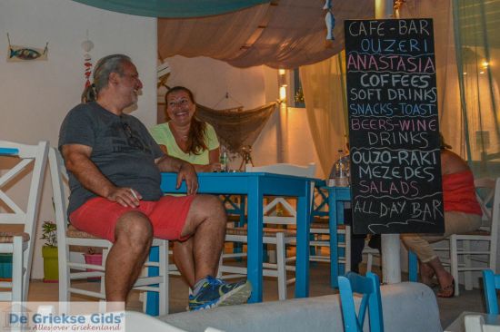 Tegen het einde van de middag keer ik terug naar het appartement en na de douche loop ik naar het strand. Op het strand zelf zijn er twee zaken. Ik twijfel, zal ik bij de ouzerie gaan of de taverna. Beide zaken zien er erg gezellig uit en bevinden zich op een idyllische plek. Ik kies voor Cafe-Ouzeri Anastasia. Ik ga zitten en wordt vriendelijk aangesproken door een mevrouw die goed Grieks spreekt maar waar ik aan het accent ook kan horen dat ze niet Grieks is. Zij heet Anastasia en het is haar eigen zaak. Ze heeft geen menukaart bij zich, ze vertelt me gewoon wat ze vandaag hebben en dat klinkt goed! Ik bestel Spetsofai, iets wat ik eerder uit Corfu ken, Griekse salade Choriatiki en een zekere meneer Kostas komt me vertellen dat ze alles zelf maken en eigen recepten hebben. Het blijkt dus dat Anastasia en Kostas een stel zijn en dat ze met elkaar getrouwd zijn! Kostas is de kok van de zaak en is super aardig!