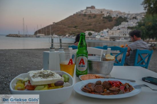 Ik nader het strand en het ziet er erg mooi, leuk en gezellig uit! Aan de overkant zie ik op de top van de heuvel het beroemde kasteel van Chora, daaronder de haven en links het strand waar je via trappen naar beneden kunt lopen. Dit lijkt me een locatie om vanavond een hapje te komen eten.