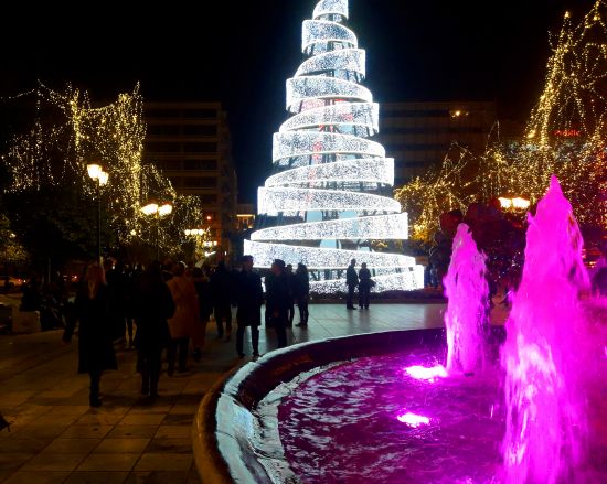 Om in de kerststemming te komen ga je naar het Syntagmaplein. De bomen op het plein zijn behangen met lichtje en de grote fontein midden op het plein spuit gekleurd water. Hoogtepunt is de grote kerstboom. Een modern exemplaar van metaal en duizenden lichtjes. Voor het ultieme kerstgevoel trakteer je jezelf op een hightea in de wintergarten van hotel Grand Bretagne. Dit hotel- gehuisvest in een indrukwekkend neoklassiek gebouw- ligt op de hoek van het Syntagmaplein. In de kerstperiode toveren ze hun atrium om tot wintergarden.
